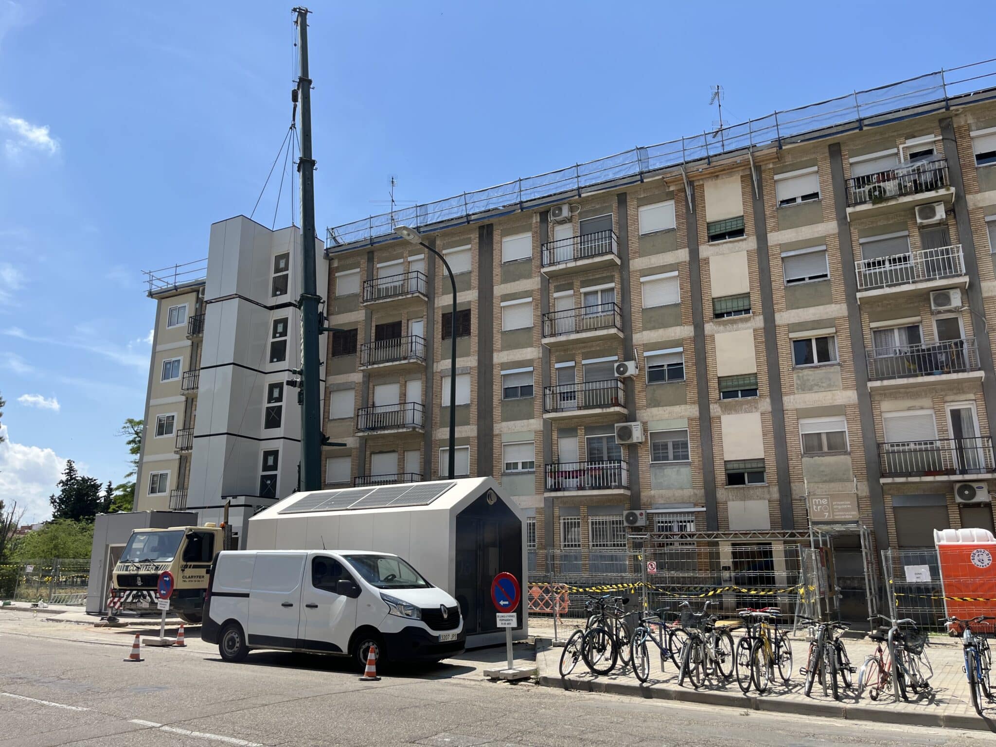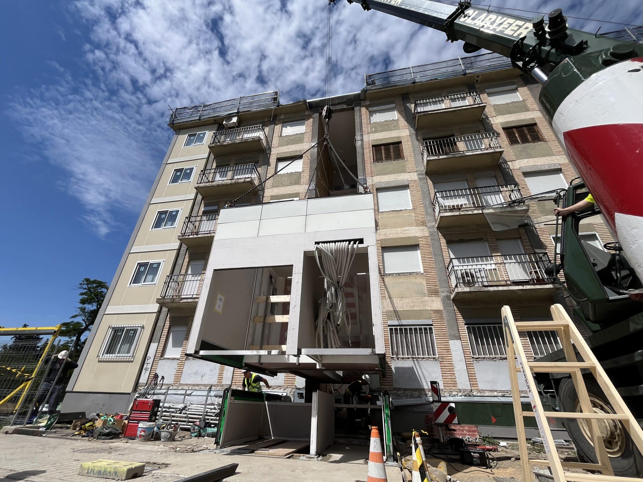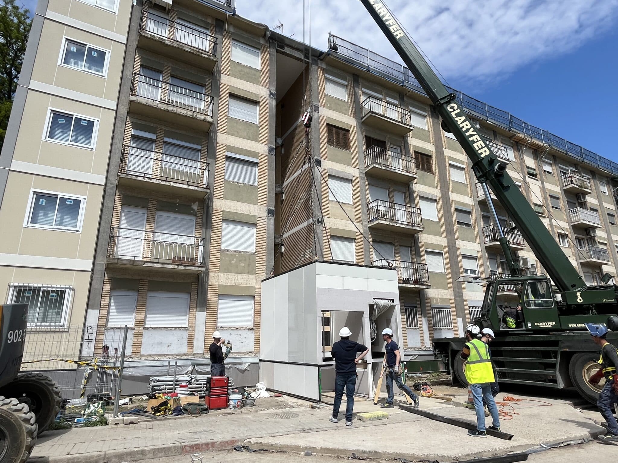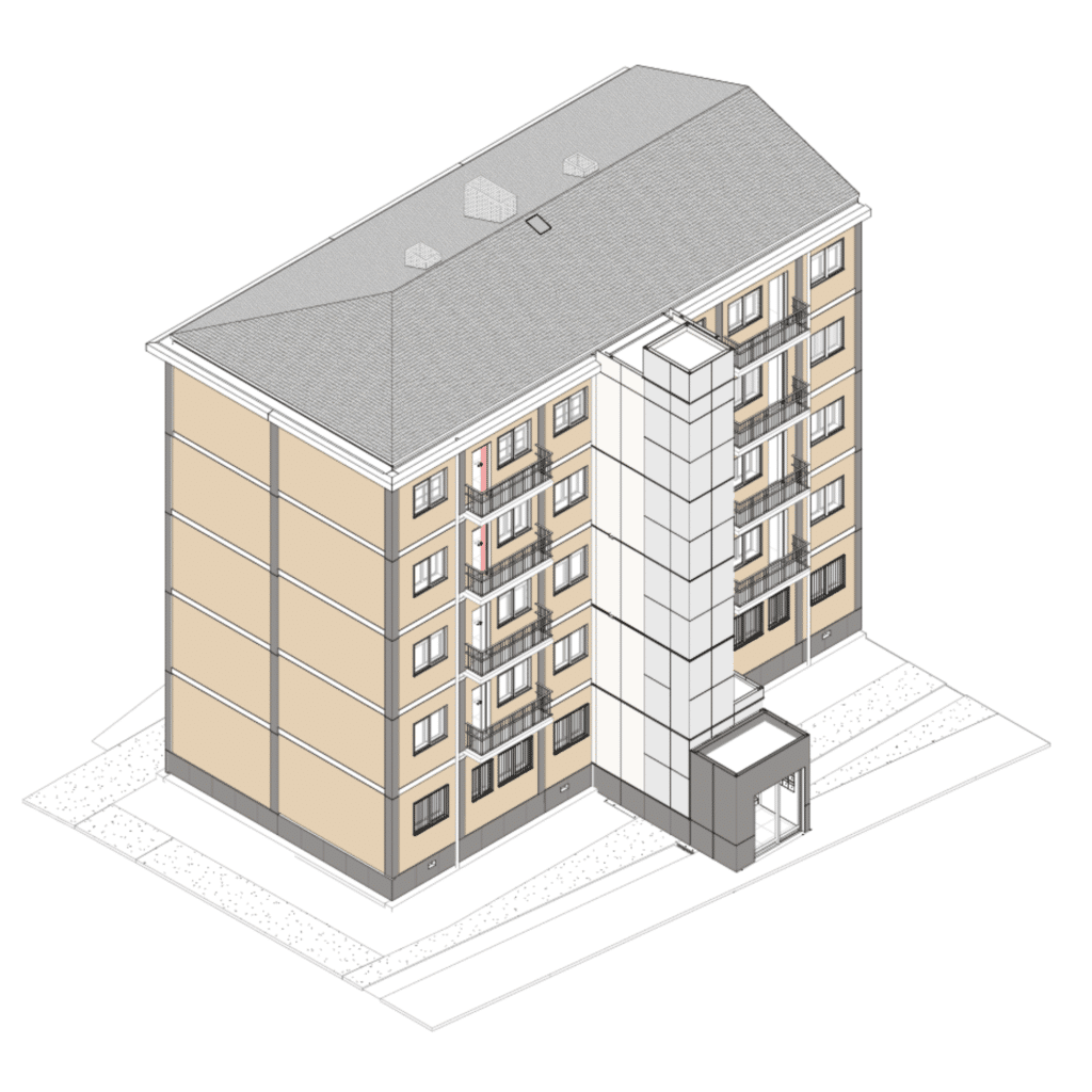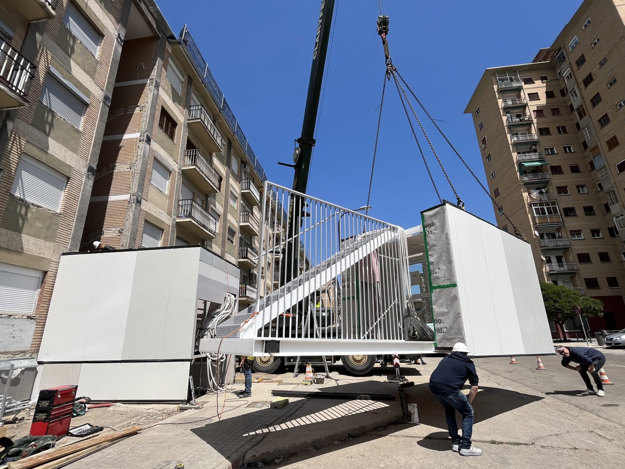 Se construyen de forma modular de forma 100% offsite las torres de comunicaciones del edificio que incluyen ascensor y escaleras. El montaje in situ de cada torre tiene una duración de 2 jornadas laborales; un total de 40 viviendas se benefician de estas mejoras de accesibilidad.