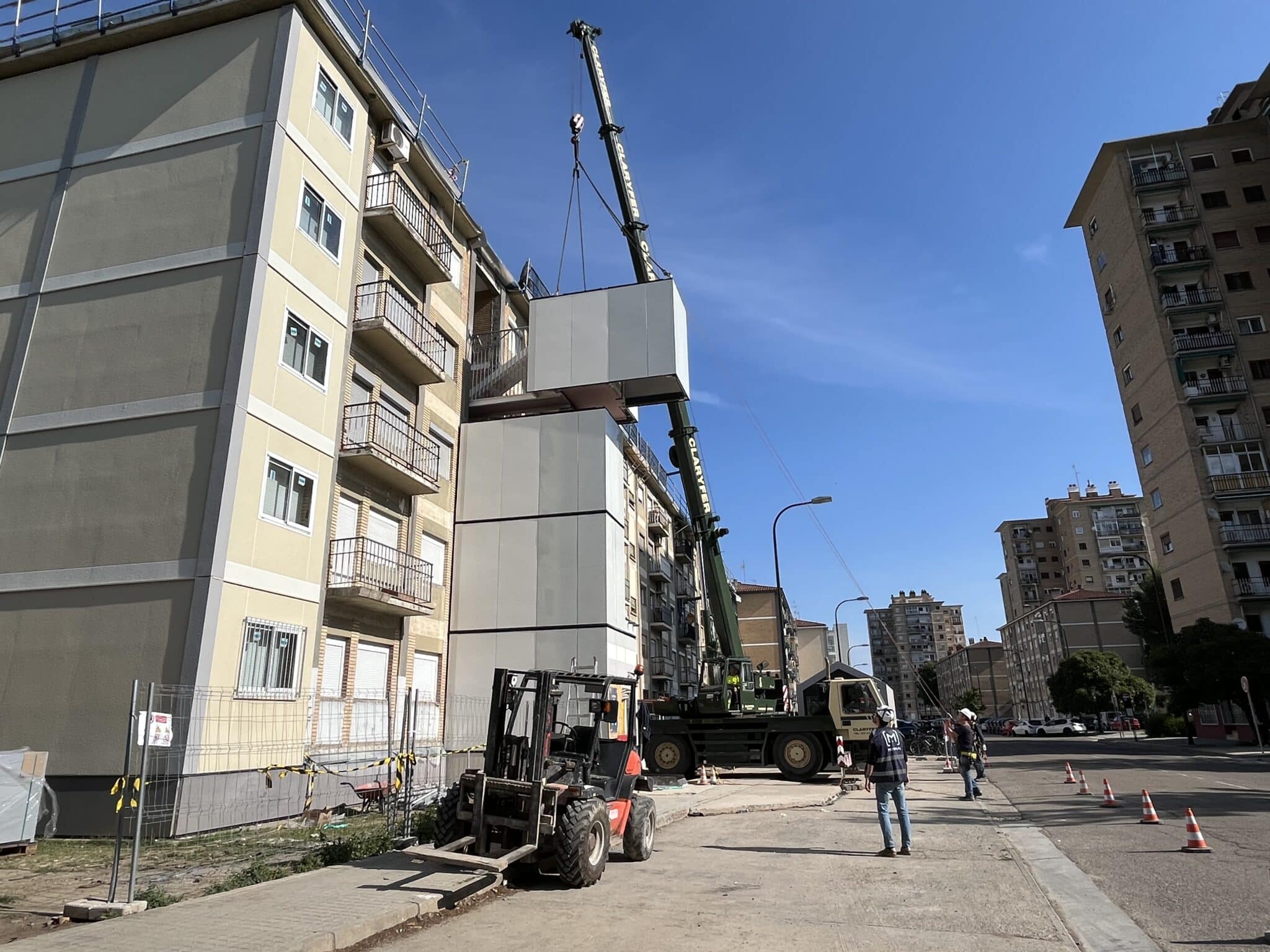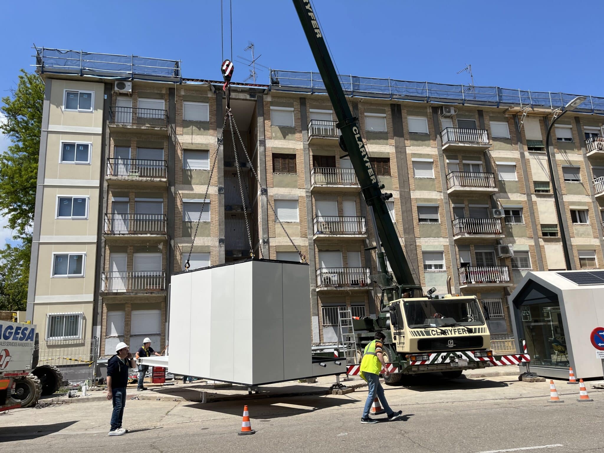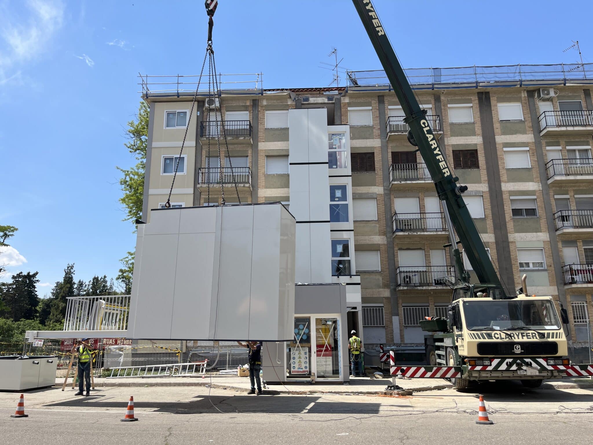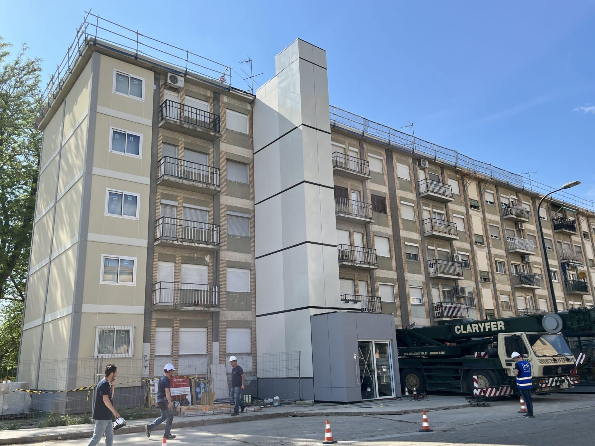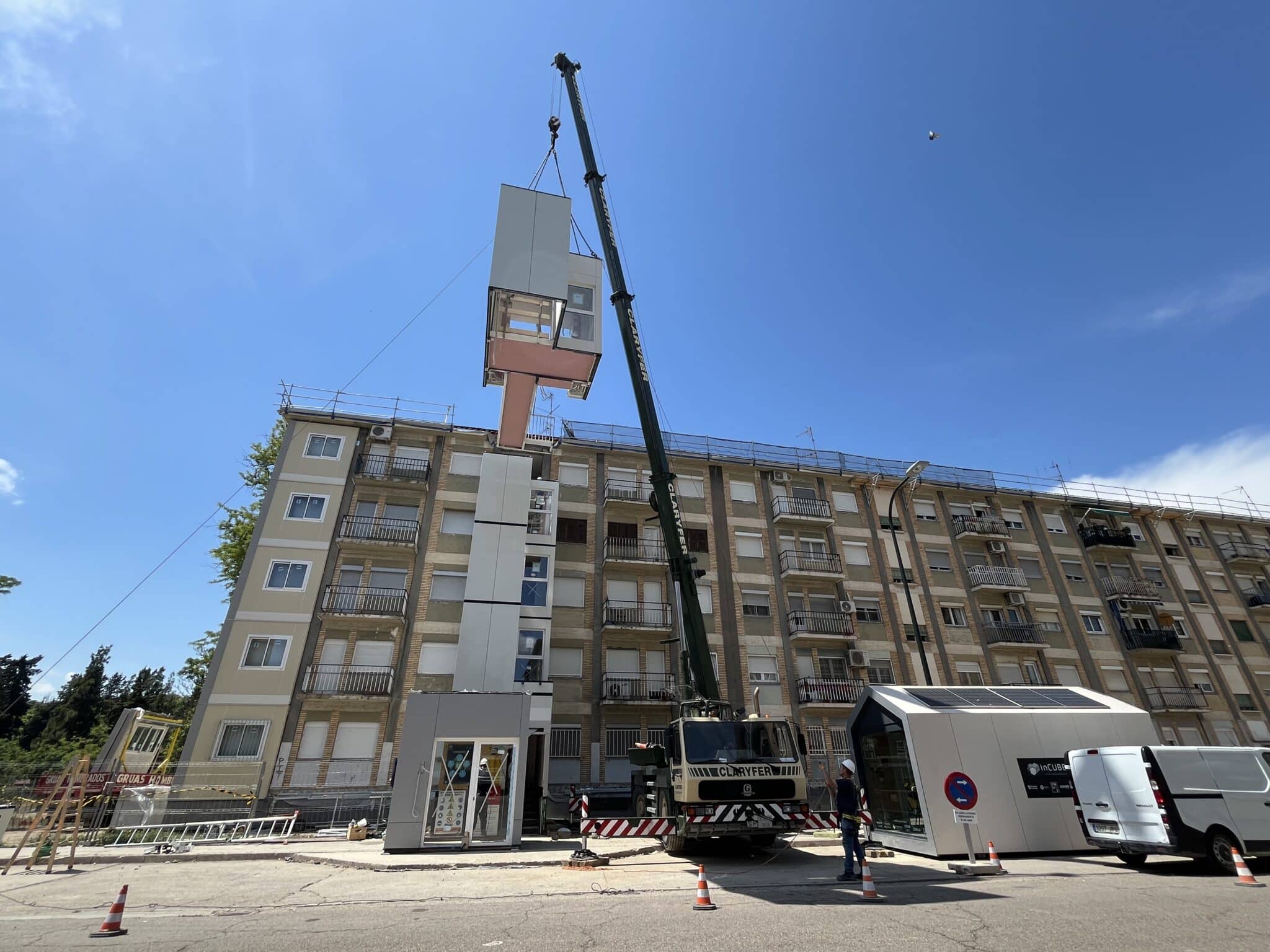 Se construyen de forma modular de forma 100% offsite las torres de comunicaciones del edificio que incluyen ascensor y escaleras. El montaje in situ de cada torre tiene una duración de 2 jornadas laborales; un total de 40 viviendas se benefician de estas mejoras de accesibilidad.