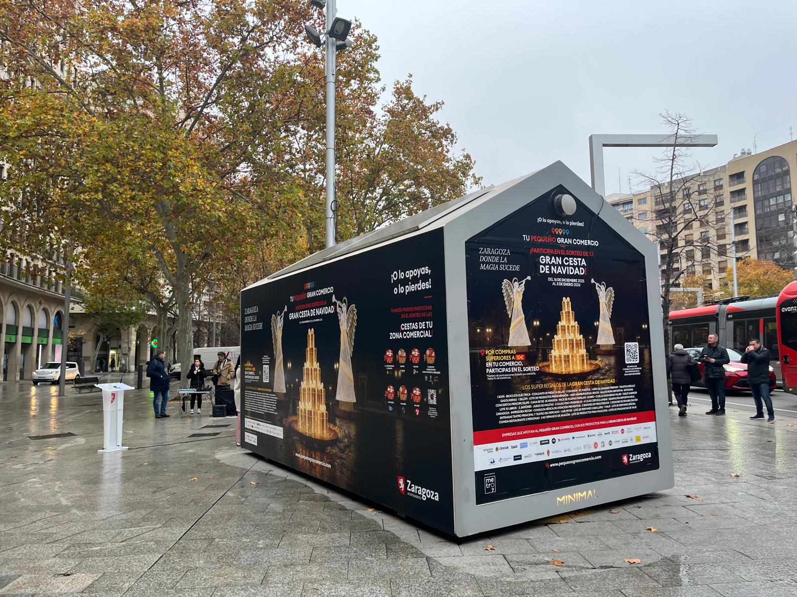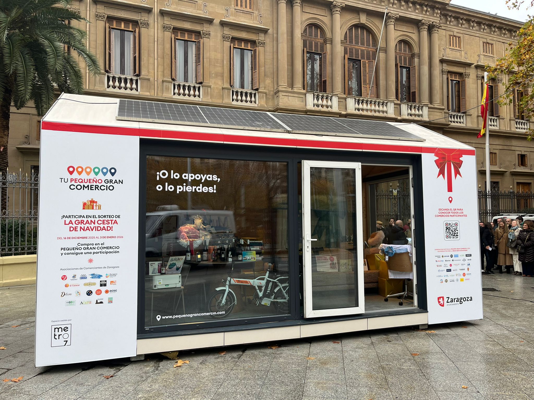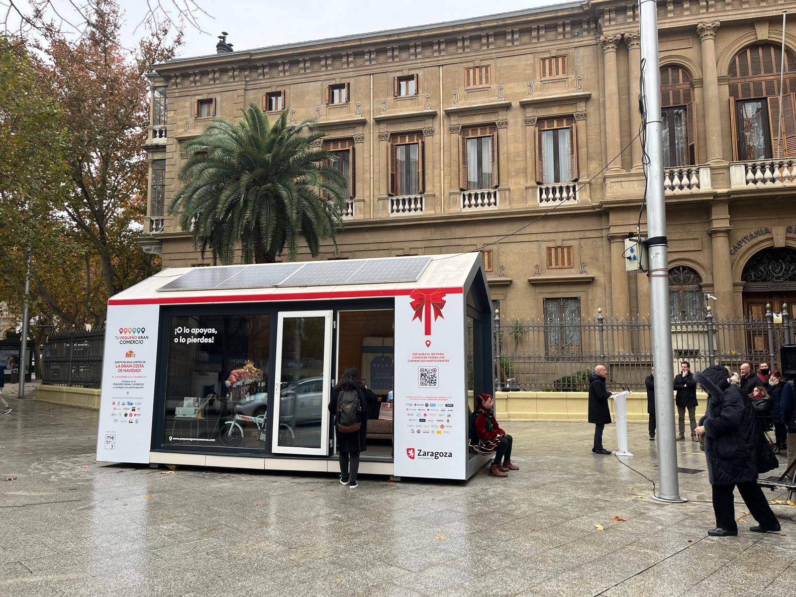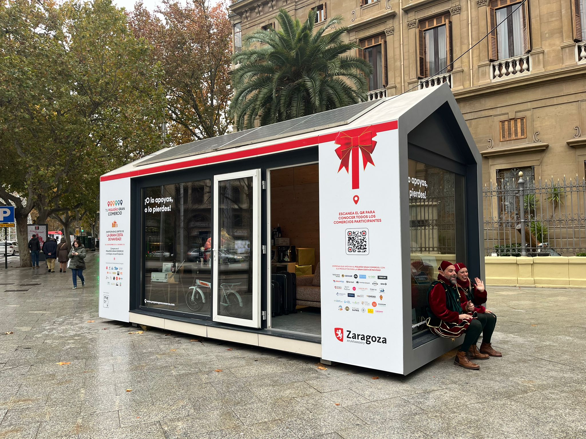 El Ayuntamiento de Zaragoza realiza campaña de apoyo al comercio de la ciudad con casi 500 establecimientos adheridos. Un total de 17 asociaciones de comerciantes de la ciudad conforman la campaña “Tu pequeño gran comercio. O lo apoyas o lo pierdes”. Para la campaña offline se llena el módulo Minimal de premios valorados en 12.000€ a modo escaparate, desde un sofá hasta un colchón o un ordenador portátil. El módulo instalado en pleno centro de Zaragoza, se concibe como la opción idónea para campañas comerciales o arquitectura para retail sin obras. Edificios construidos en tiempo récord garantizando un control total de costes y cuyos espacios son 100 % personalizables, transportables, ampliables, sostenibles, eficientes y con un diseño singular.